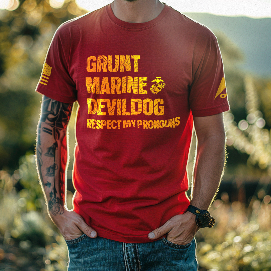 Let's face it. In the Corps, we had our own language, our own unique identities, and we earned those titles with blood, sweat, and maybe a few grumbles. The DIA Respect My Pronouns USMC Grunt tee captures the pride we all carry. Plus, this shirt throws down a challenge.